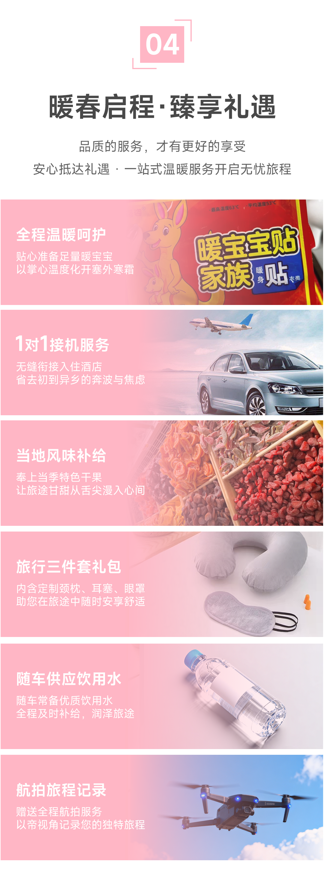 1、赠送随车饮用水+特色应季水果(或者新疆干果)+暖宝宝+旅行三宝; 2、赠送全程航拍+集合日提供24小时接机服务。 【赠送项目】不需要的也不退不换 |