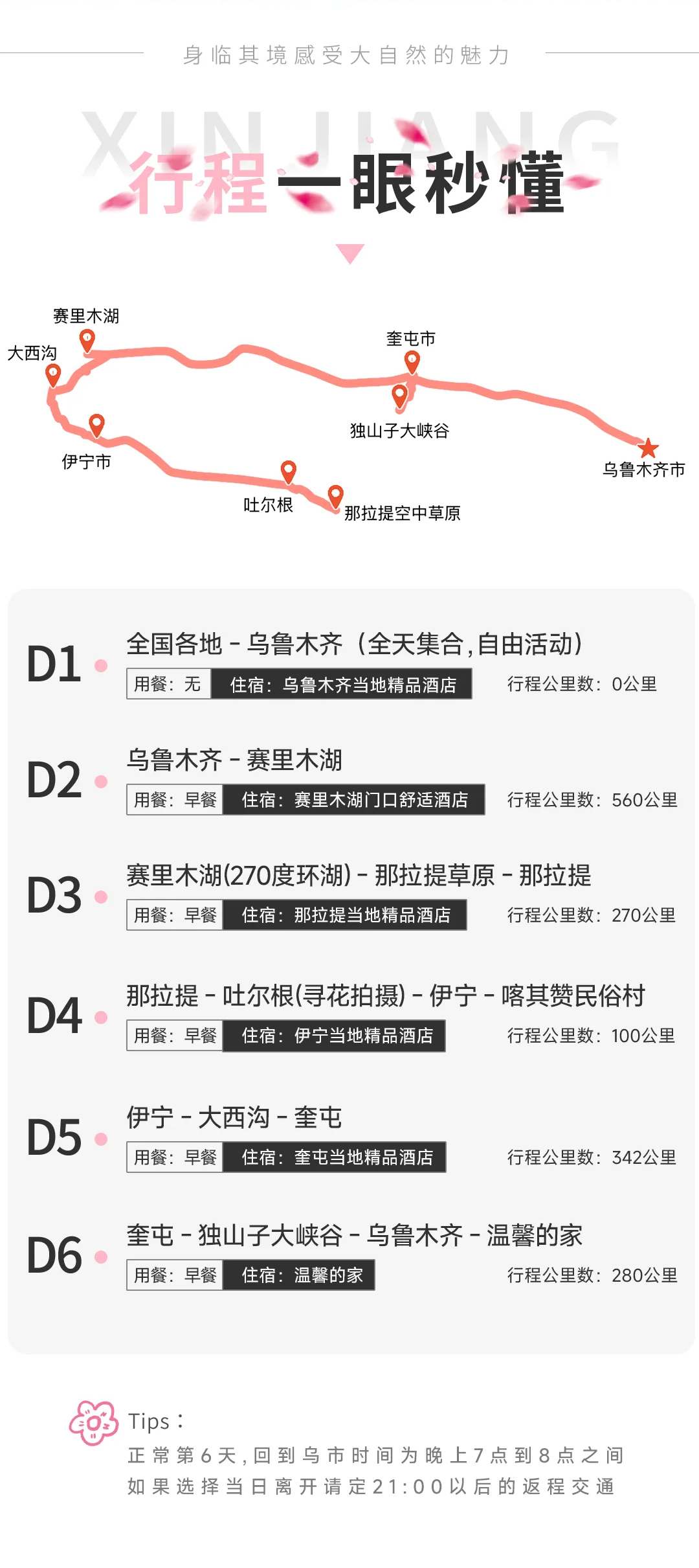 1.全程5晚住宿:乌鲁木齐当地精品酒店(标间,独卫)*1晚,赛里木湖门口舒适型标间(独卫,可沐浴)*1晚,那拉提当地精品酒店标间(独卫,可沐浴)*1晚,伊宁市当地精品酒店标间(独卫,可沐浴)*1晚,奎屯当地精品酒店标间(标间,单独卫浴)*1晚, 2.全程根据人数安排车型。本团为散拼行程,保证1人1座,不接受指定车型,车上座位轮流坐: 2-3人安排5座轿车(本田雅阁,丰田凯美瑞或同级), 3.精品团由司机兼职向导服务(协助办理入住,购买门票,简单讲解,不随同进入景区); 4.全程含5个早餐,正餐请自理(团餐质量较低,路上领队会组织大家AA); 5.全程门票:赛里木湖门票及环湖费,吐尔根门票,大西沟门票及区间车,那拉提空中草原门票及区间车,独山子大峡谷门票。 门票均已按照春季景区优惠票核算,则均无其他优惠票可退。 |