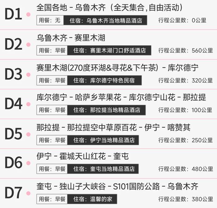 1.全程6晚住宿 乌鲁木齐当地精品酒店(标间,独卫)*1晚,赛里木湖门口舒适型酒店(标间,独卫)*1晚,库尔德宁当地特色民宿(标间,独卫)*1晚,伊宁当地精品酒店(标间,独卫)*1晚,那拉提当地精品酒店(标间,独卫)*1晚,奎屯当地精品酒店(标间,独卫)*1晚, 2.全程根据人数安排车型:本团为散拼行程,保证1人1座,不接受指定车型,车上座位轮流坐: 2-3人安排5座轿车(本田雅阁,丰田凯美瑞或同级), 3.领队:司机兼向导(多年经验,熟悉路况,了解当地风土人情),司机协助购票办理入住,不陪同进景区; 4.餐食:全程含6个早餐,正餐请自理(团餐质量较低,路上领队会组织大家AA); 5.全程门票费用(赛里木湖门票及VIP环湖费用,库尔德宁门票+区间车, 那拉提空中草原门票+区间车 |