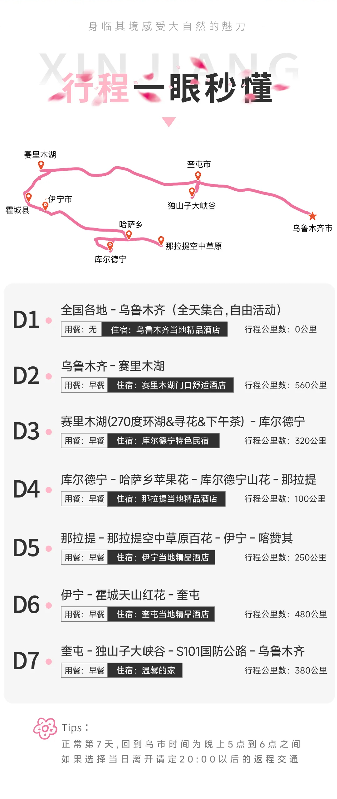 【排期说明】景色是有季节性的,每年花期情况受天气影响较大,不同景色会有不同的观感,请以平常心待之! 第一期:2026年04月25日——05月01日(五一) 第二期:2026年04月29日——05月05日(五一) 第三期:2026年05月01日——05月07日(五一) 第四期:2026年05月02日——05月08日(五一) 第五期:2026年05月03日——05月09日(五一) 第六期:2026年05月06日——05月13日 第七期:2026年05月09日——05月16日 费用: 成人4980元/人,儿童3880元/人 单房差1100元/人 (一大一小请按2成人报名或另补房差) 线路纯玩,不安排购物点 |