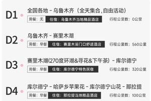 晚上入住赛里木湖景区门口酒店。 【温馨提示】 1.新疆地域宽广,每天的行车时间比较长,请提前做好准备哟。另外为了避免肚饿,可以自备一些小零食; |