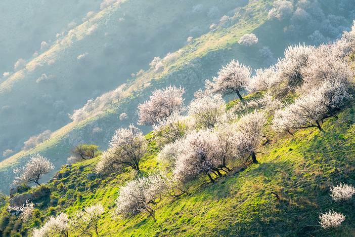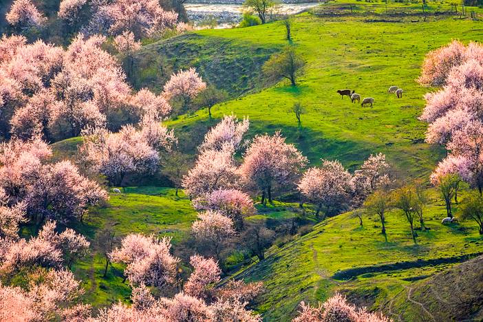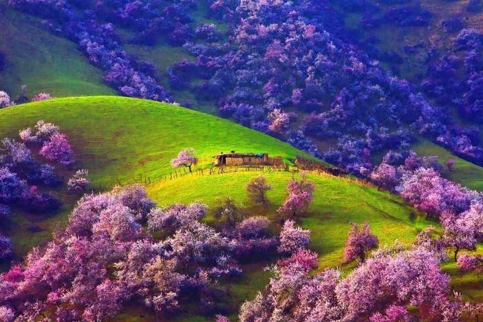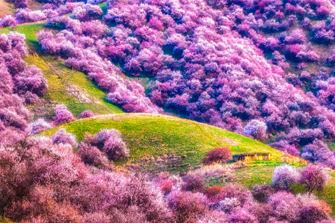 吐尔根乡的杏花沟,这是一片中世纪遗留下来最大的原始杏花林,或集中、或散落于巩乃斯河北岸,距218国道3公里处,占地有3万多亩,是我国野杏林集中地之一。到山梁放眼望去,杏树满山遍坡,千株万棵,枝根相接,人入其中,隔数尺而只闻其声不见其影。