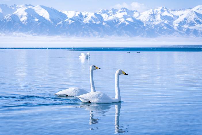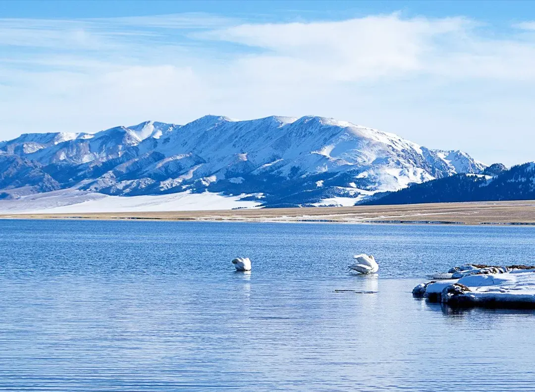 早上用完早餐后,一路驱车前往“天使之泪”赛里木湖。四月的赛里木湖,基本上是一半是湖水一半是冰面,湖边依然会堆着很多积雪,基本远处的山脉基本通体覆盖着皑皑白雪。若遇好天气,阳光照在半湖半冰的湖面上,湖畔云杉苍翠,一切犹如水墨画般的精致,而这个时节在赛里木湖遇上天鹅等珍禽在湖面纷飞的可能性较大。
