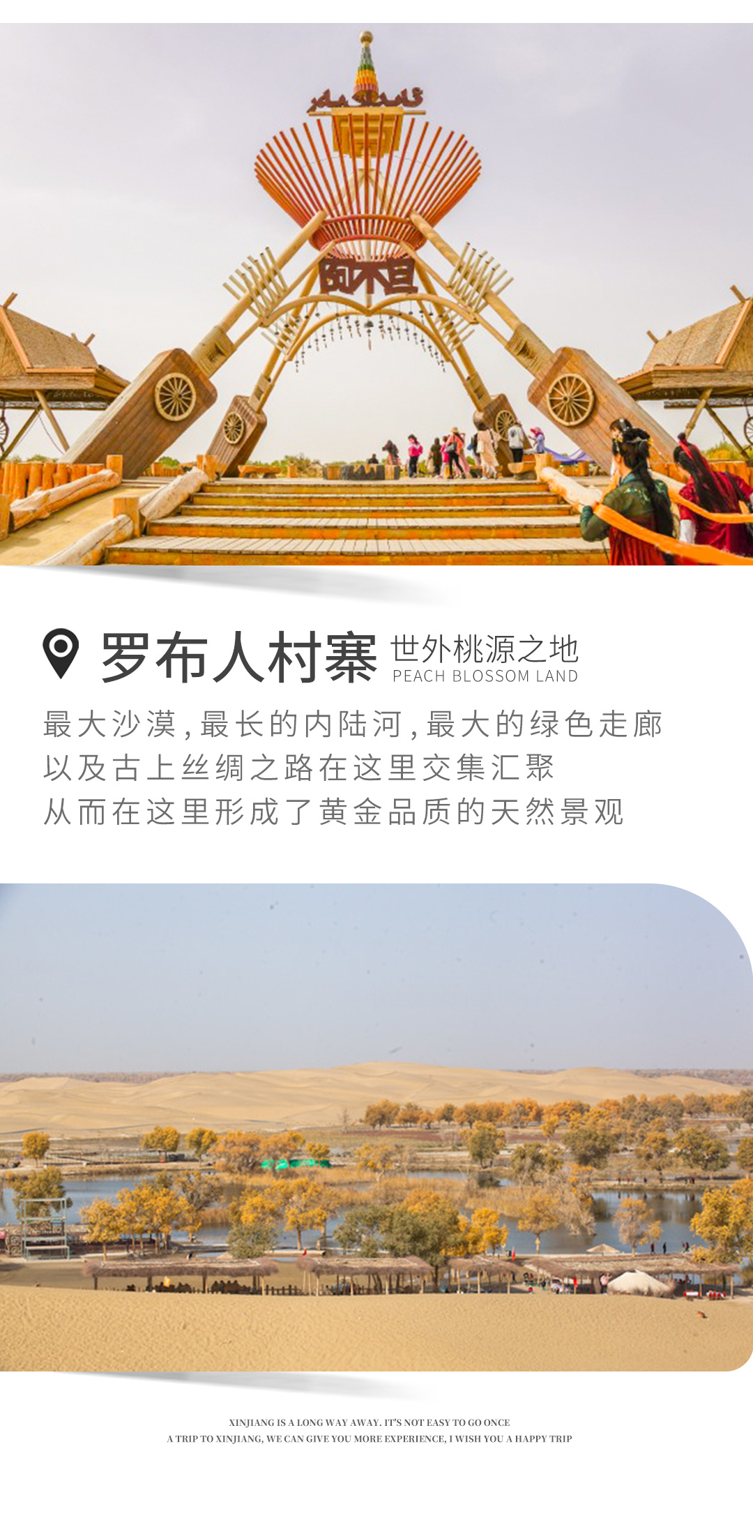 在这里感受自然与人文不同风光,罗布人文化,千年不死、千年不倒、千年不朽的胡杨,骑沙漠之洲骆驼(费用自理),与世界第二大、中国最大的流动沙漠—