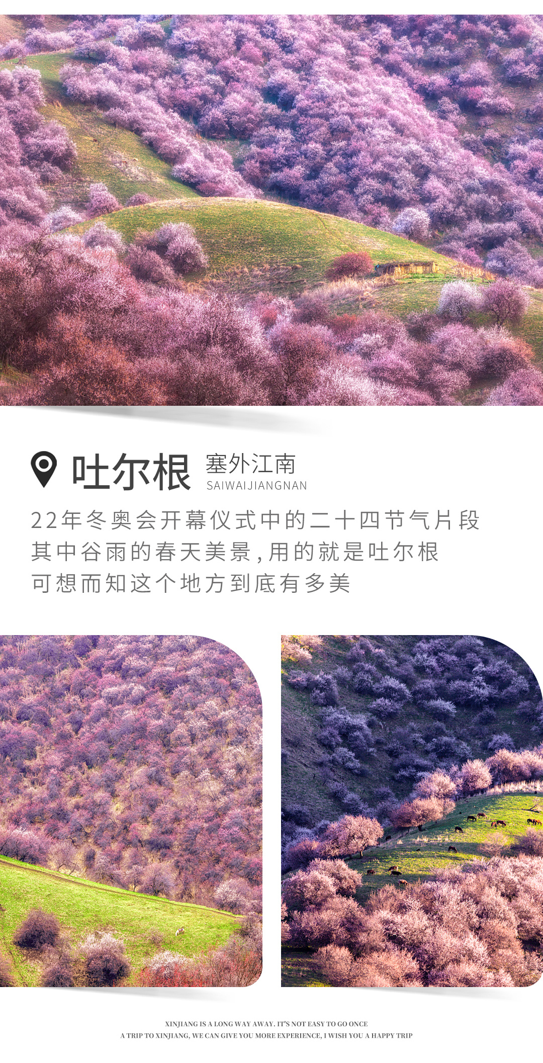 新疆的杏花,通常在4 月中上旬盛开,杏花花期较短,受气温以及天气变化影响较大,每年花期不固定,无法确保最佳花期。不同地方花开时间不同,敬请谅解!也可能因为天气原因会涉及行程的微调,届时请配合导游工作。