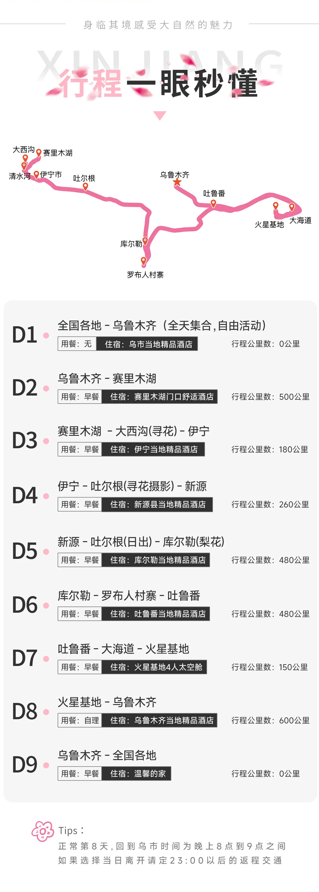4、行程中的所有出发/抵达时间、行程中游览时间、抵达景点时间等仅供参考,可能会因为淡旺季客流量、路况情况、限速等存在一定的误差,敬请谅解!