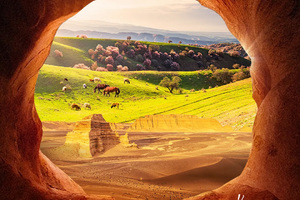 2.吐尔根杏花花期过后,绿草茵茵的吐尔根草原,优美的波浪曲线,加上漫山遍野的牛羊,远处的天山雪山,构成了一副绝佳的画面,让很多摄影爱好者趋之若鹜。这也是我们保留一定要去一次吐尔根杏花沟的原因,不错过任何美景。