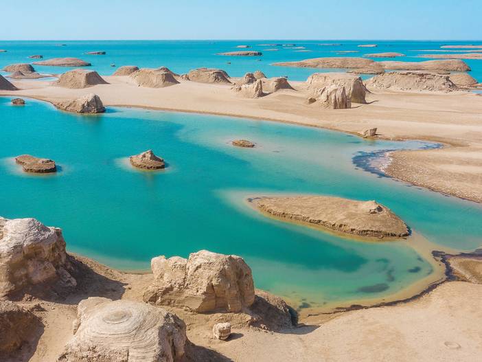 这是国内仅有的水上雅丹地貌群,由于塔达木盆地的地壳运动而让青海湖等地的湖水通过地下流入了这雅丹境内,才形成了我们眼前所见到的独特的水上雅丹地貌。湛蓝水面上的雅丹地貌一群群簇拥在一起,宛如万国舰队一般漂浮在水面上,壮观无比。我们可以在这里欣赏【雅丹日落】,今晚我们住的距离景区不远,我们可以等到欣赏日落后再选择离开!