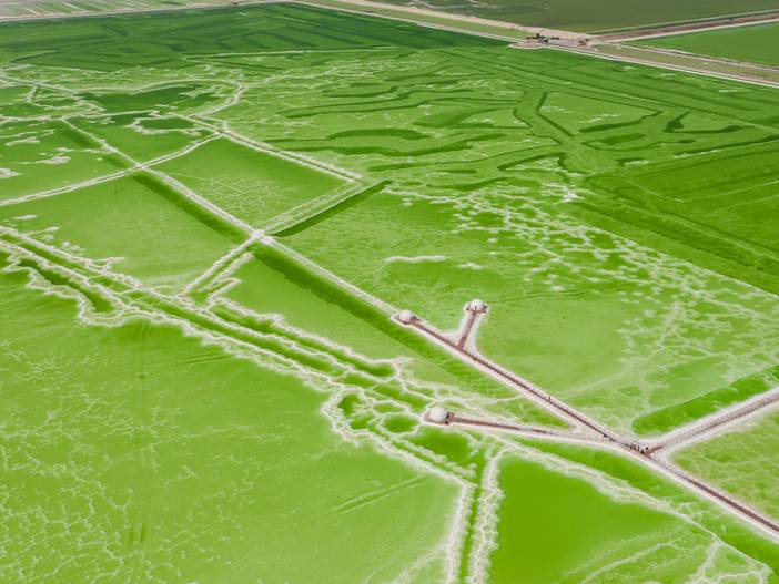 碧波万顷的湛蓝外围散布着金灿灿的亮黄
