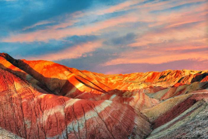 | 抵达“中国最美的七大丹霞地貌”之一【张掖七彩丹霞】。就像上帝不小心打翻了颜料盒,涂抹的山间色彩斑斓,宛如七彩缎带;光线打到丹霞岩壁上,美不胜收 | ||