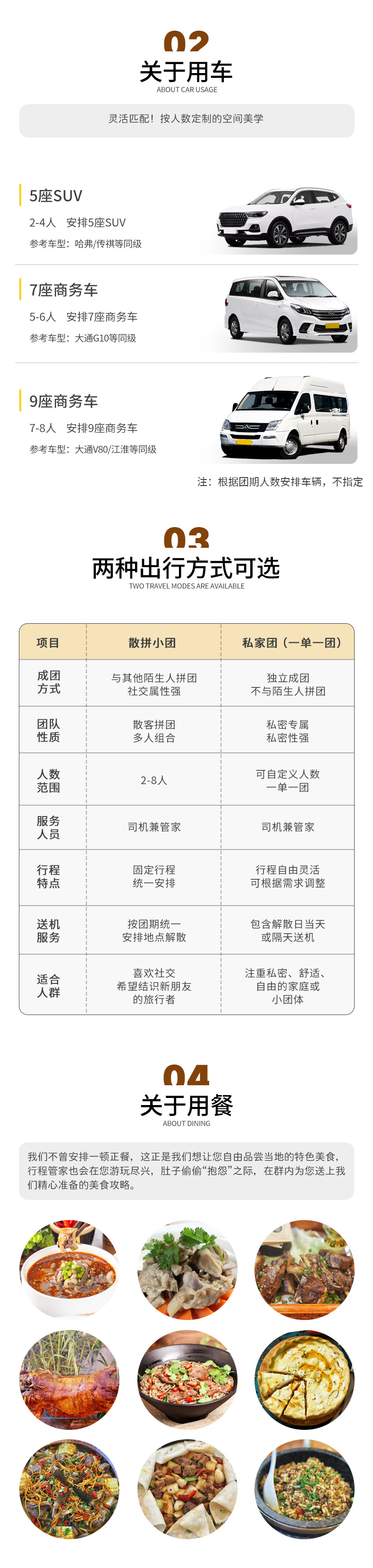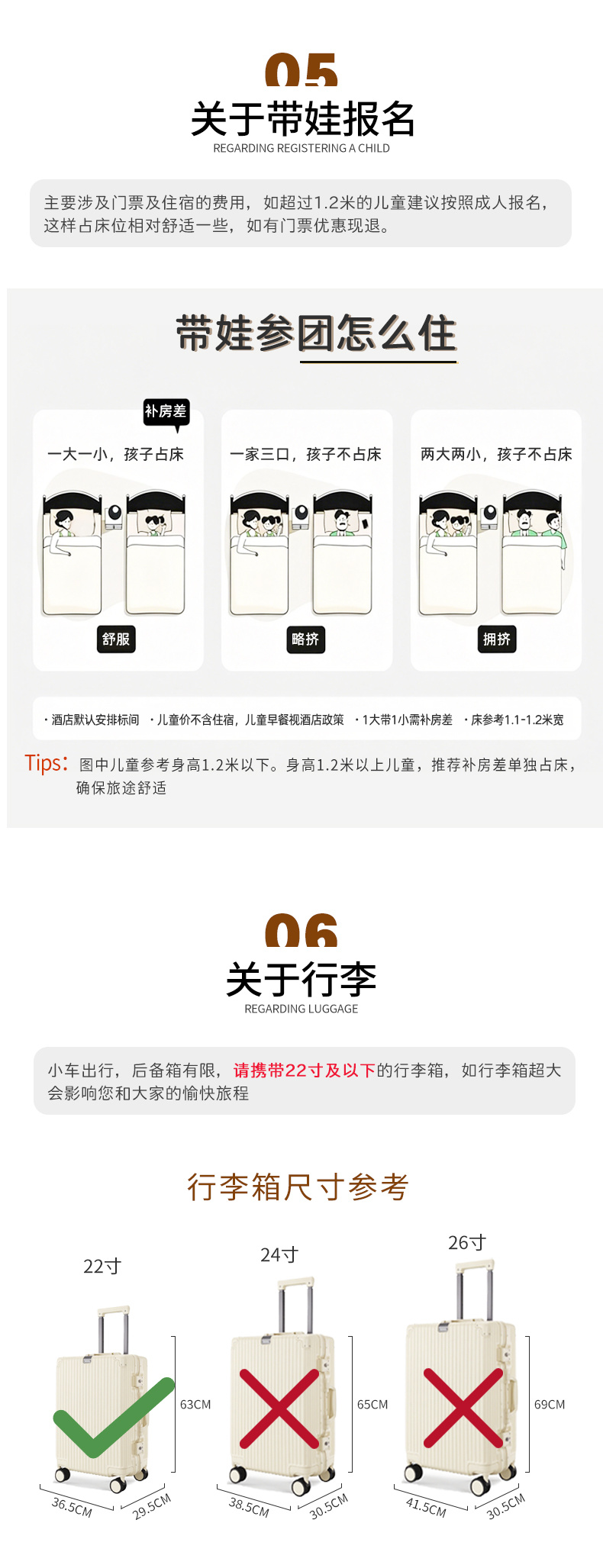 1、本产品不接受以下旅游者报名:传染性疾病、心脑血管疾病、呼吸系统疾病、精神病、严重贫血病、大中型手术的恢复期病患者、75周岁(含)以上老年人、孕妇及行动不便者以及其他不适宜出行者。出于旅游安全考虑,建议旅游者在出行前做一次必要的身体检查,预订人请务必准确、及时转达并核实旅游者的身体状况后再报名,否则由此引发的不良后果和所有费用由预订人和旅游者自行承担。 2、请您在预订时务必提供准确、完整的信息(姓名、性别、证件号码、国籍、联系方式、是否成人或儿童等),以免产生预订错误,影响出行。如因客人提供错误个人信息而造成损失,我社不承担任何责任。 3、由于政府政策原因,外国友人暂时无法报名;港澳台地区同胞默认两人起收,如单人报名需补酒店单房差。 4、18岁以下未成年人不可单独报名,需要至少一名18周岁以上59周岁以下直系亲属全程陪同方可报名。 5、70周岁(含)以上老年人预订出行需确保身体健康适宜旅游,并有18周岁以上59周岁以下直系亲属全程陪同出行。 6、涉及高海拔地区(包括西藏、青海、四川、云南、贵州、新疆、甘肃部分地区等)线路,因地理环境的特殊性,以及个人身体素质条件不同,可能个体会出现不同程度的高原反应,建议根据自身情况做好相关评估和准备。行程中,出现严重的高原反应请及时通知服务人员或旅行社,旅行社将给予必要的协助,但产生额外的救助费用将由个人承担,如决定中途退团的,仅退还未产生的门票费用。 7、请在约定的时间到达集合地点,切勿迟到,以免耽误您和其他游客行程。若因迟到导致无法随团游览,将按照当天解除合同处理,或您也可以与旅行社协商自行前往下一集合地点,但因此增加的费用由您自理,因行程耽误而没有参加的交通、景区、活动、住宿等费用无法退还。 8、本产品行程实际出行中,在不减少景点且征得客人同意的前提下,我司服务人员可能会根据天气、交通等情况,对您的行程进行适当调整(如调整景点游览顺序等),以确保行程顺利进行。 9、出游过程中,如遇不可抗力因素造成景点未能正常游玩,我司服务人员经与客人协商后可根据实际情况取消或更换该景点,或在现场按旅游产品中的门票价退还费用,退费不以景区挂牌价为准,敬请谅解。 10、如遇路况原因等突发情况需要变更各集合时间的,届时以我司服务人员公布为准。 11、行程中的赠送项目,如因交通、天气等不可抗因素导致不能赠送的、或因您个人原因不能参观的,费用不退,敬请谅解。 12、团队行程中,非自由活动期间,未经我司服务人员同意,不得擅自离团或脱团。 如您选择中途离团,经服务人员同意后,应签署书面离团协议,未完成部分将被视为您自行放弃,仅退还未产生的门票费用。因此产生的人身财产安全等问题,游客自负。 13、植物类景观(枫叶、樱花、油菜花等),可能会因天气原因导致观花不佳等情况,敬请谅解 14、为了记录您在旅途中的美好瞬间,服务人员可能会为您以及同行人员拍摄一些照片,这些照片可能会被选中用于本产品活动分享、产品宣传、新媒体运营等,若您不同意授权我司使用的,请您在报名时备注。 15、本产品属于群体性活动,考虑到其他旅游者的健康和安全问题,不得携带宠物上团。 16、持老年证、军官证、军残证、残疾证、学生证、导游证等优惠证件的游客可享受景区门票优惠政策,具体以出行当日景区公布政策为准。请具备条件的游客携带好相关证件,届时由领队或我司工作人员统一安排,按打包行程中客人已享的优惠价格,现场退还差价。 |