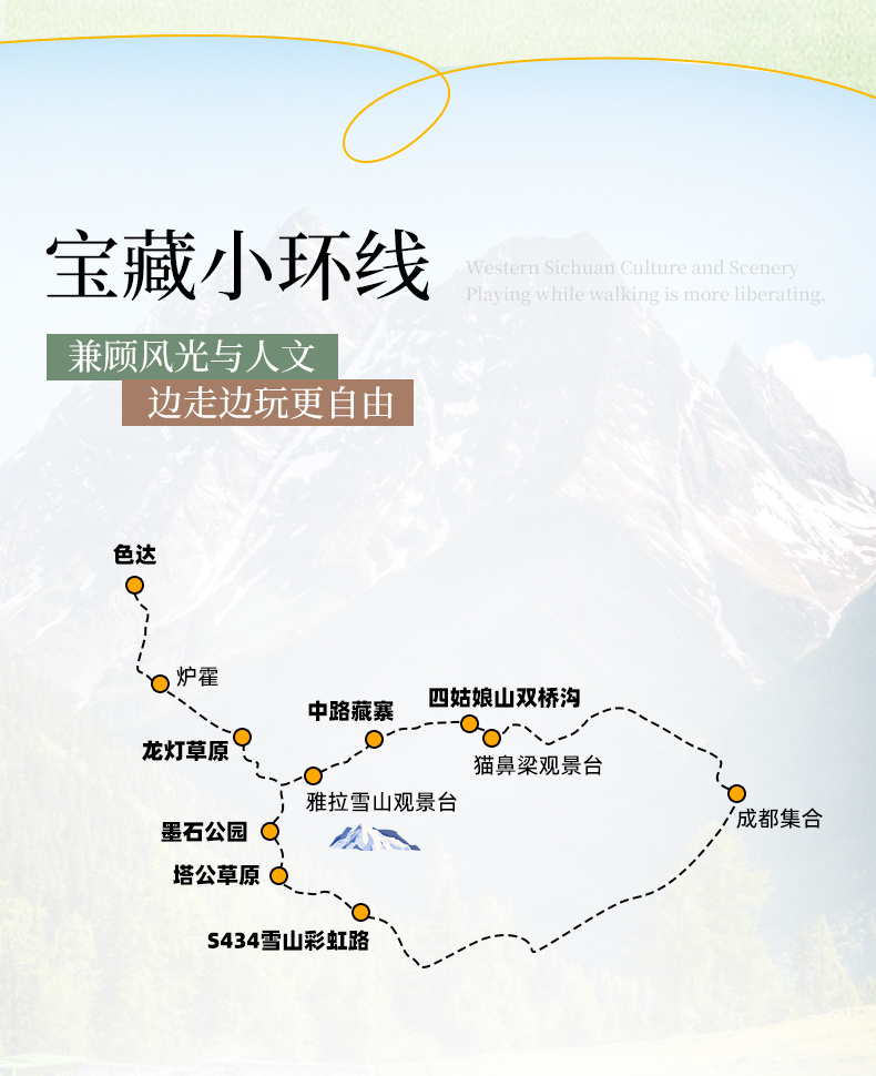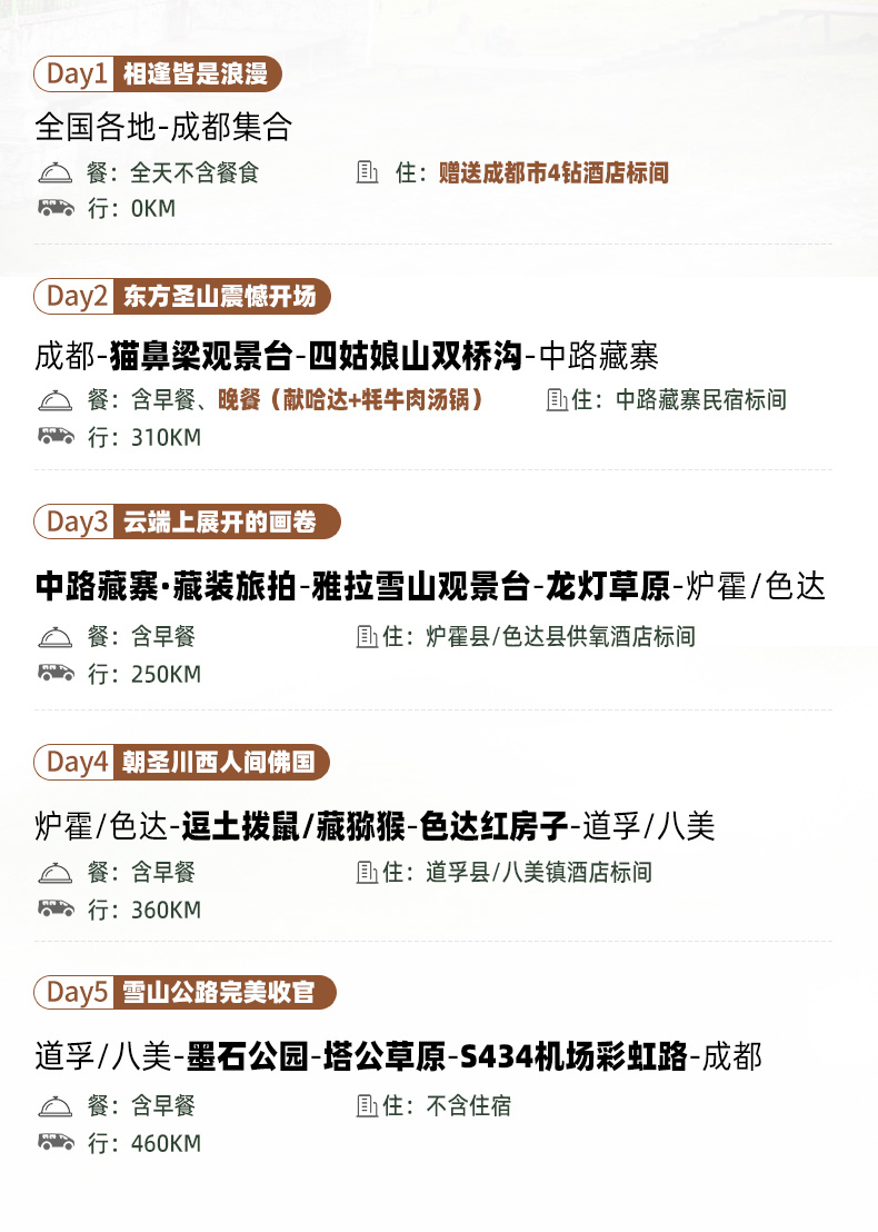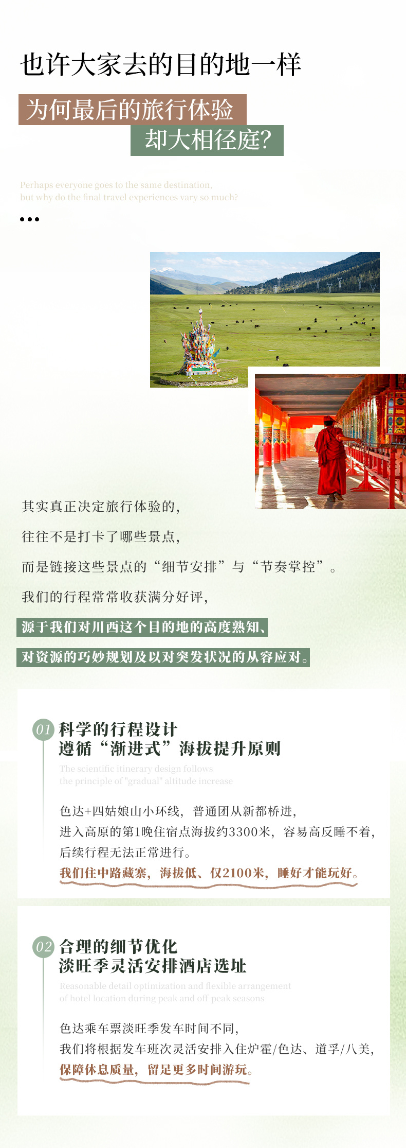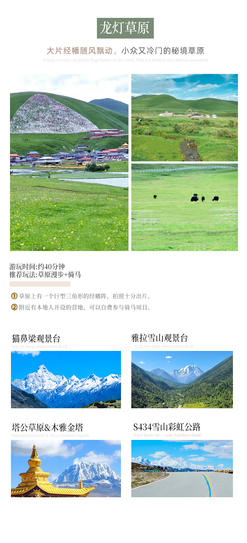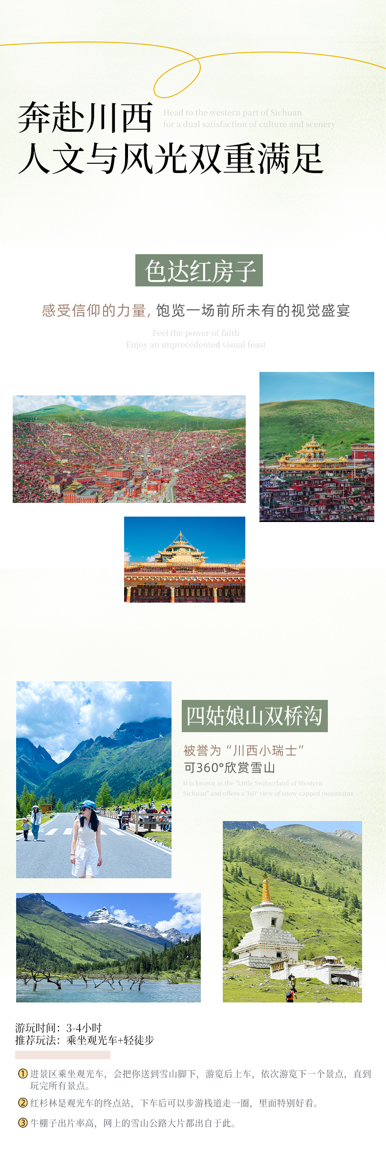 4、景交:四姑娘山观光车70元/人(必须),塔公草原35元/人(可选),色达预约48元/人,报名后请根据自己的游玩日期自行预约;