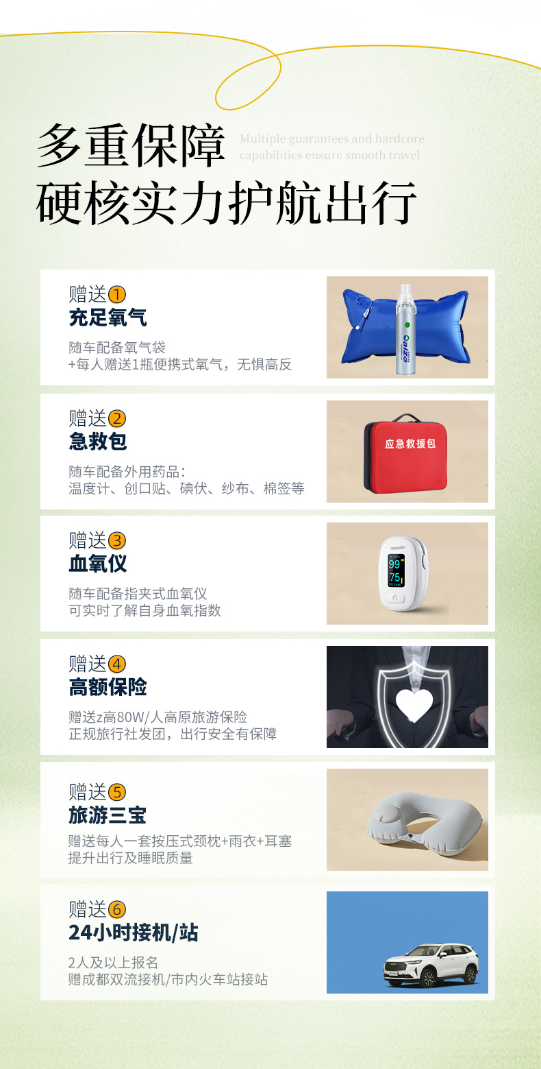 4、随团配备:氧气袋+急救包+血氧仪+温度计,随时观察了解客人的身体状况。