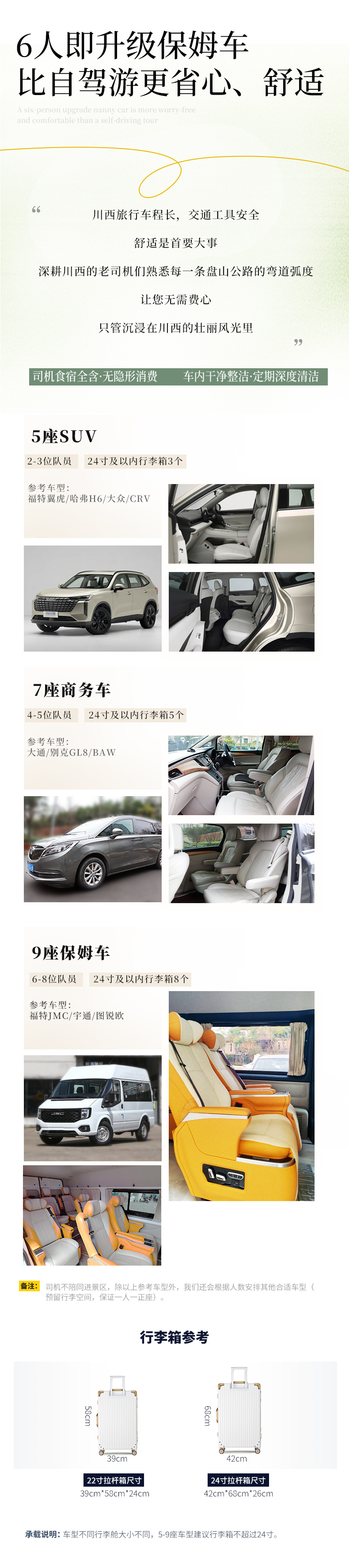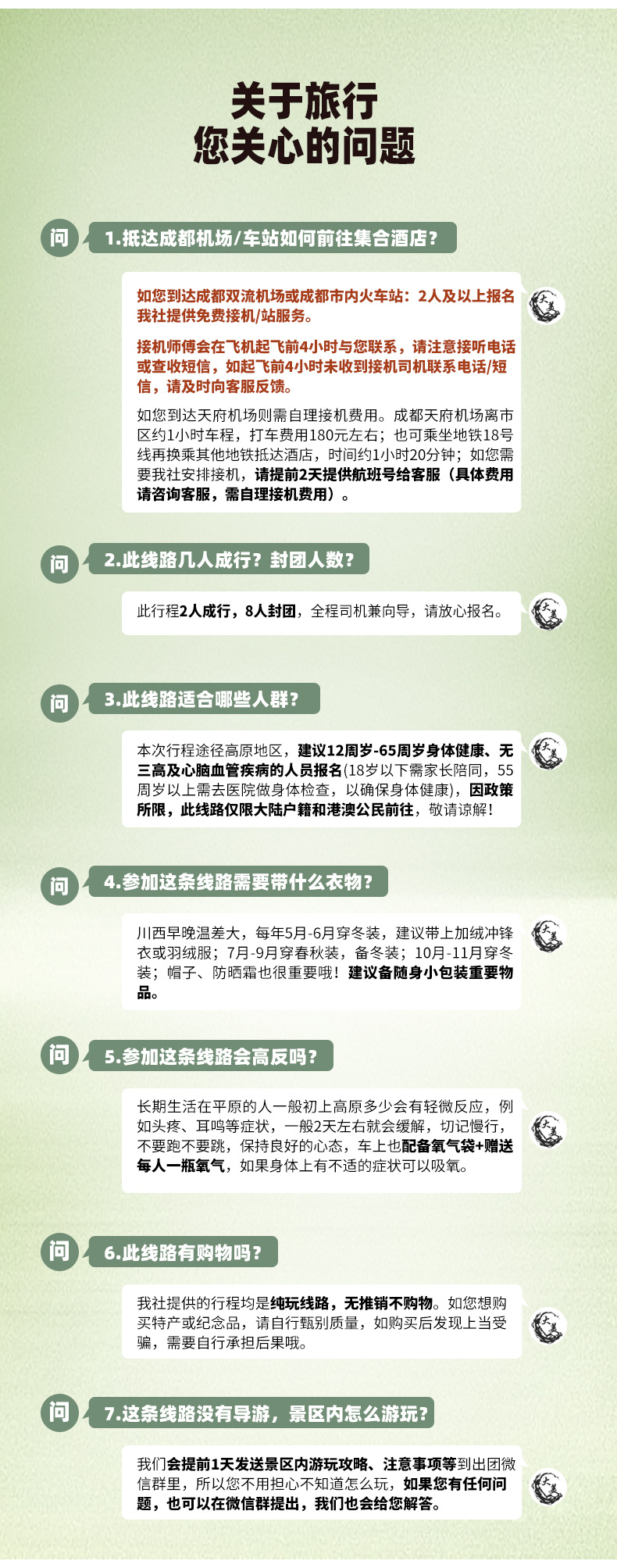 7、2人及以上报名赠成都双流机场接机/市内火车站接站(成都东站、成都南站、成都西站)1次,天府机场接机需自理费用。