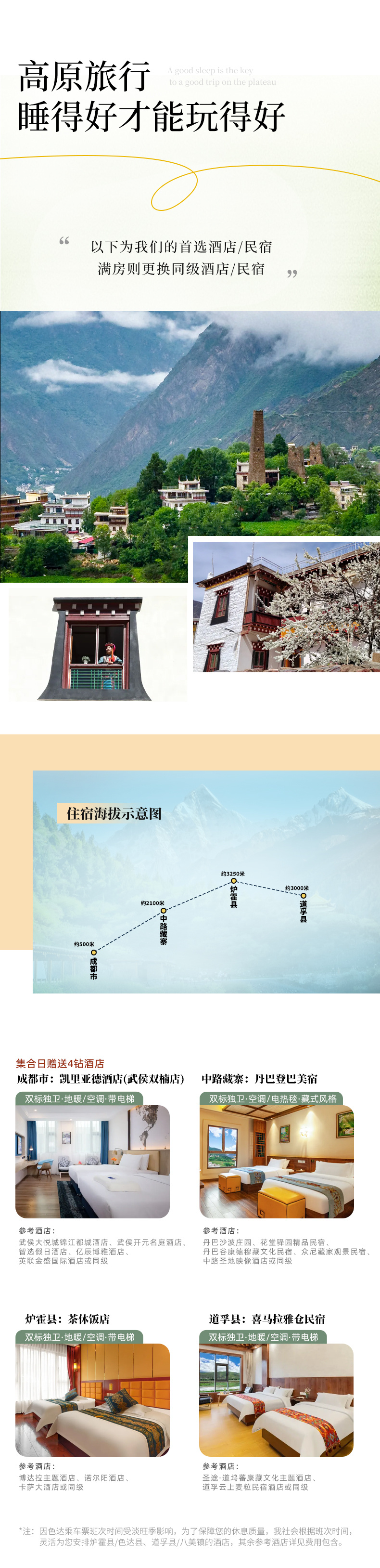 注:因色达乘车票班次时间受淡旺季影响,为了保障您的休息质量,我社会根据班次时间,灵活为您安排炉霍县/色达县、道孚县/八美镇的酒店。