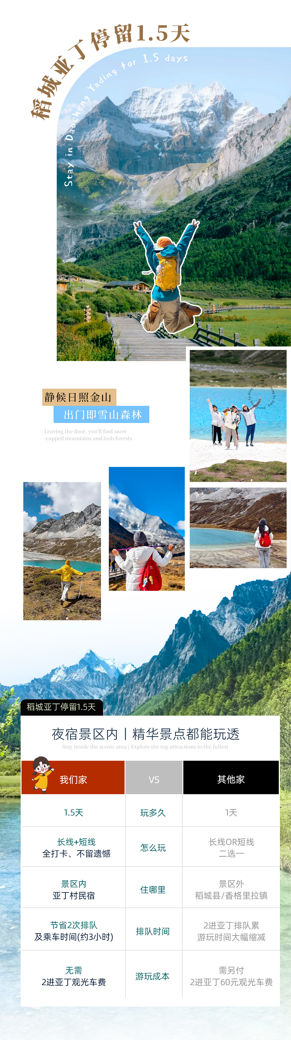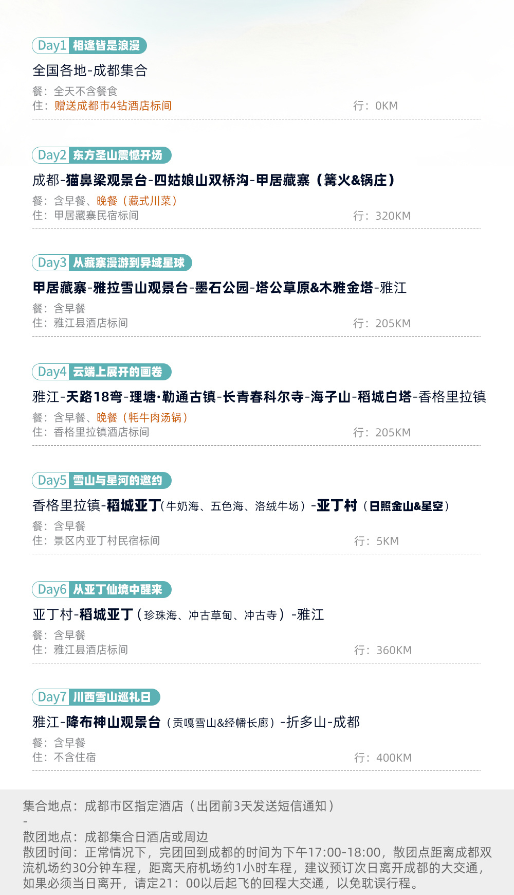 (8)关于稻城亚丁景区限流:为避免人流高峰聚集,稻城亚丁景区最大承载量为16850人,其中牛奶海、五色海区域游客承载量为3900人,我们将提前为您预约门票,如因旺季预约人数过多,不能游览牛奶海、五色海,我们将根据实际情况调整游览路线。