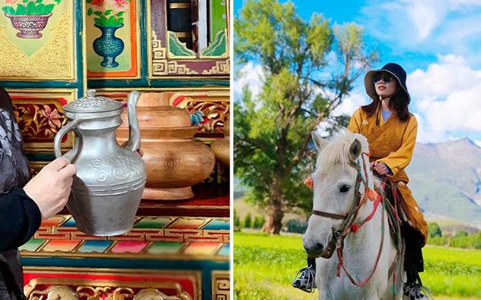 4、藏地人文体验:藏家主人献哈达+喝酥油茶+捏糌粑+骑马+射箭+挂经幡+撒隆达;