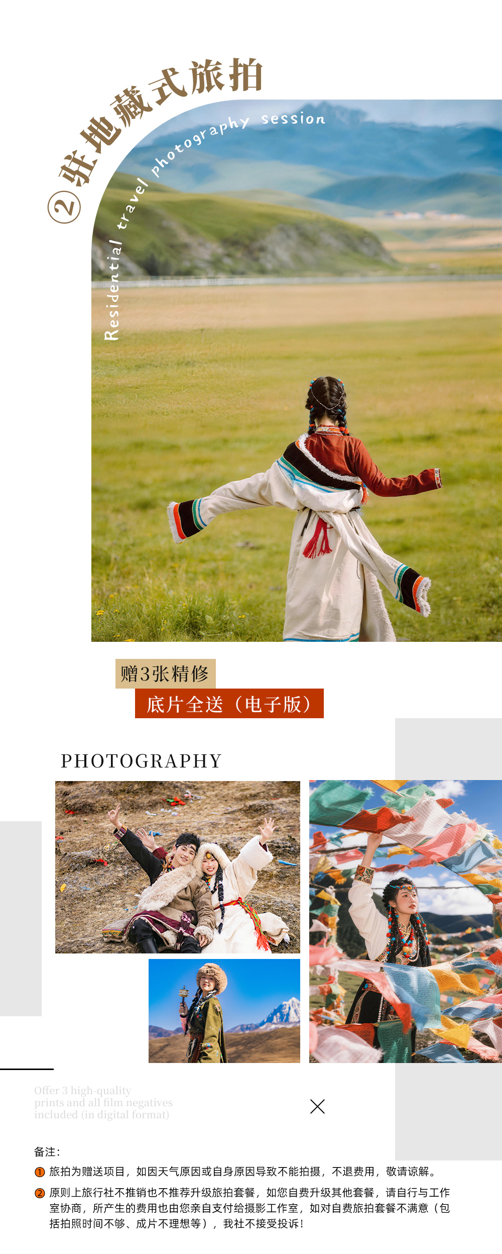 2、驻地藏式旅拍:免费提供藏装/首饰/头饰,赠3张电子版简修,底片全送;