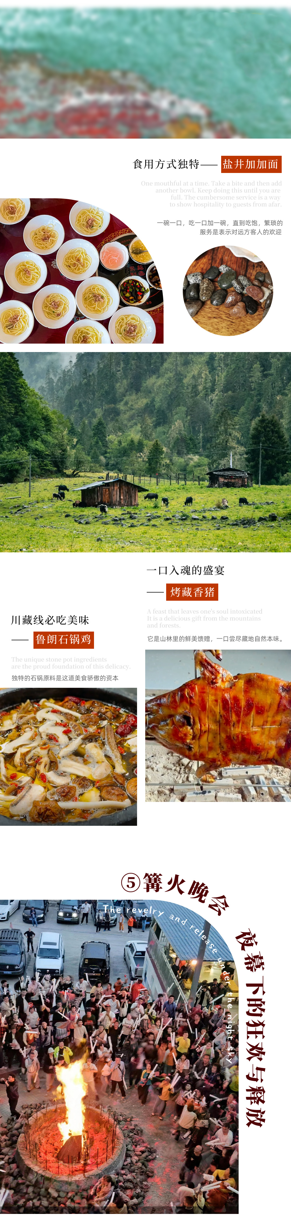 5、餐食:全程11个酒店早餐+3个正餐(盐井加加面、鲁朗石锅鸡、烤藏香猪),如队员另外点餐,需自己支付费用;