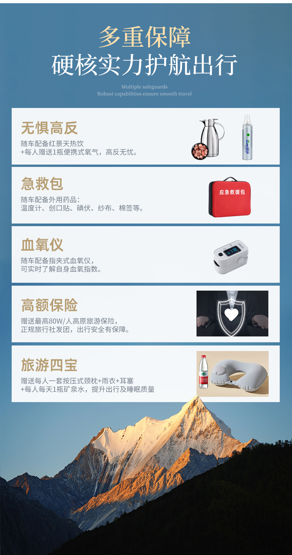 (4)急救包+血氧仪+温度计,随时观察了解客人的身体状况。