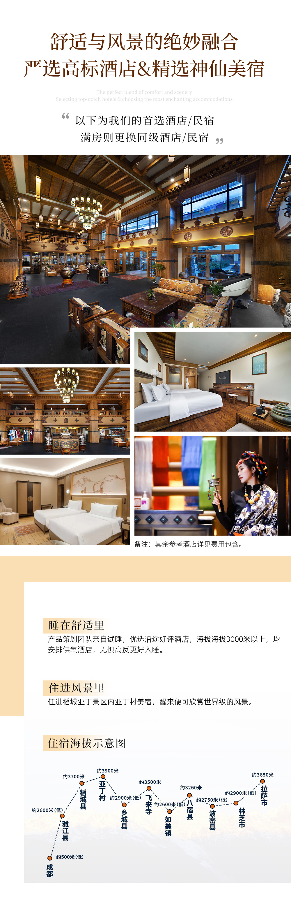 2、住宿:6晚低海拔酒店+5晚供氧酒店(海拔3000米以上安排),含集合日5钻酒店及散团日4钻酒店、不住不退;