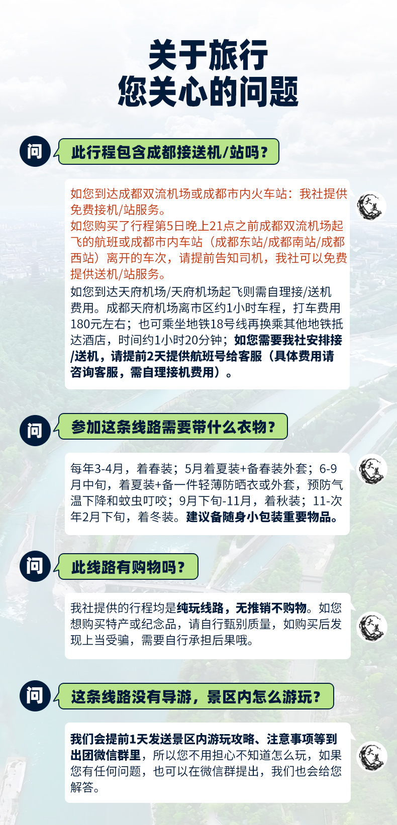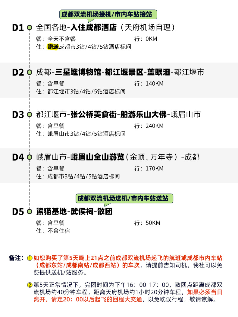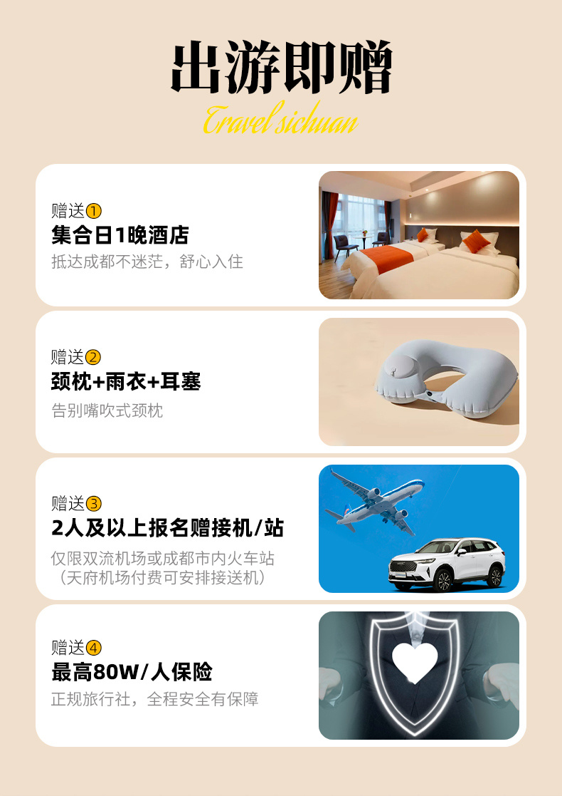 4、2人及以上报名赠成都双流机场接送机/市内火车站接送站(成都东站/成都南站/成都西站)1次,天府机场接送机需自理费用。