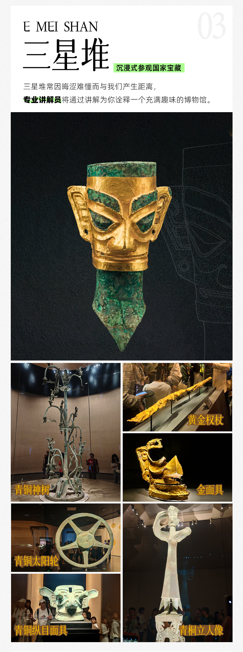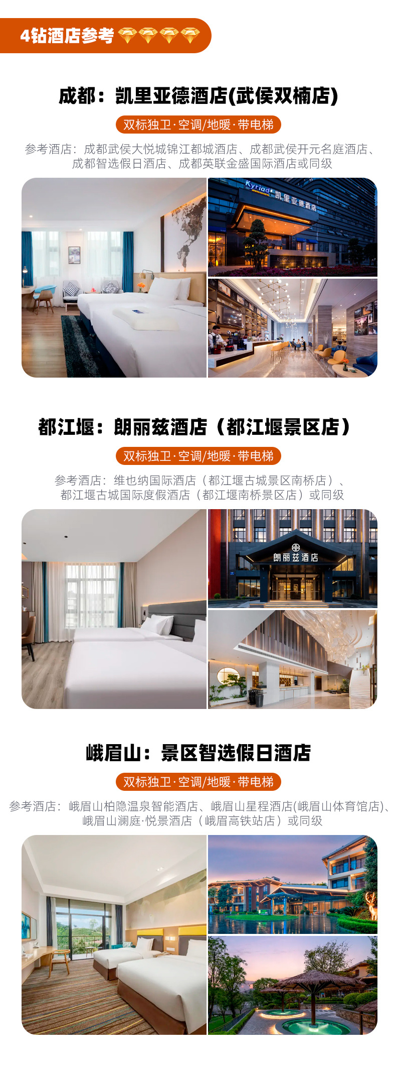 3、门票:三星堆门票+拼团讲解、都江堰门票、乐山大佛船游票、峨眉山门票、熊猫基地门票、武侯祠门票;