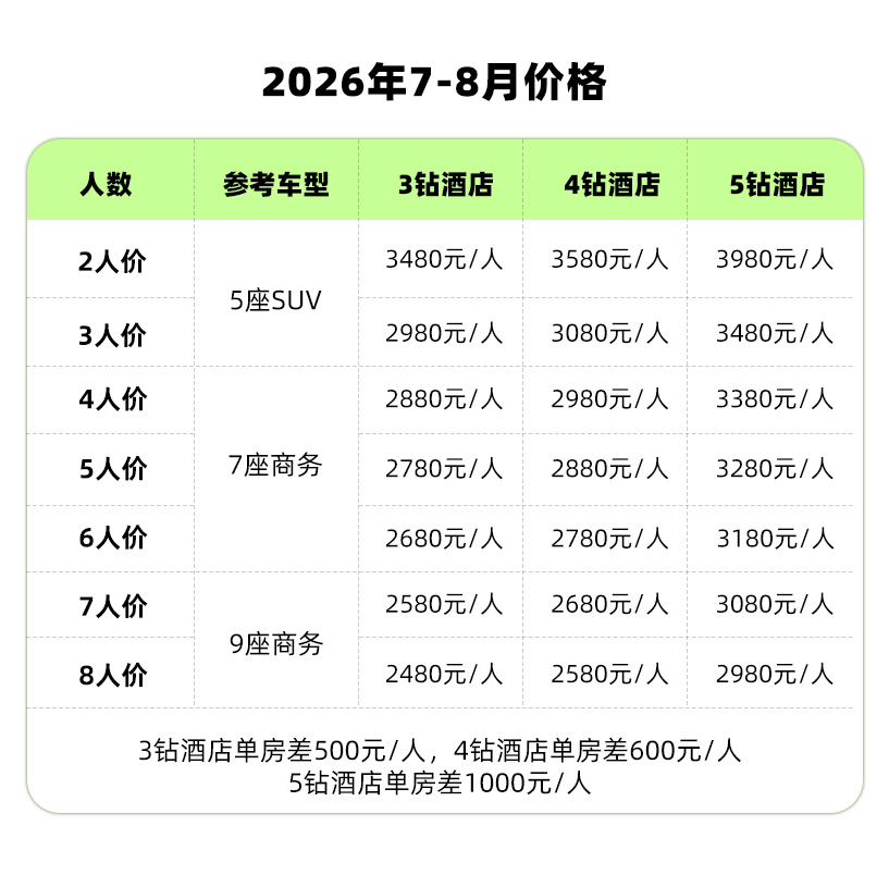 3、单房差:报价均按2人入住1间房核算,如出现单人数(例如:3人、5人、7人),请另补单房差;如果队员要求自己单独住一间房,请在报名时告知客服,并自补单房差;如果在集合日或行程进行中选择单独住一间房,则需补一间房的费用(单房差*2)。出团时间不同,单房差价格不同,具体价格请参看【活动批次】,或者直接咨询客服;